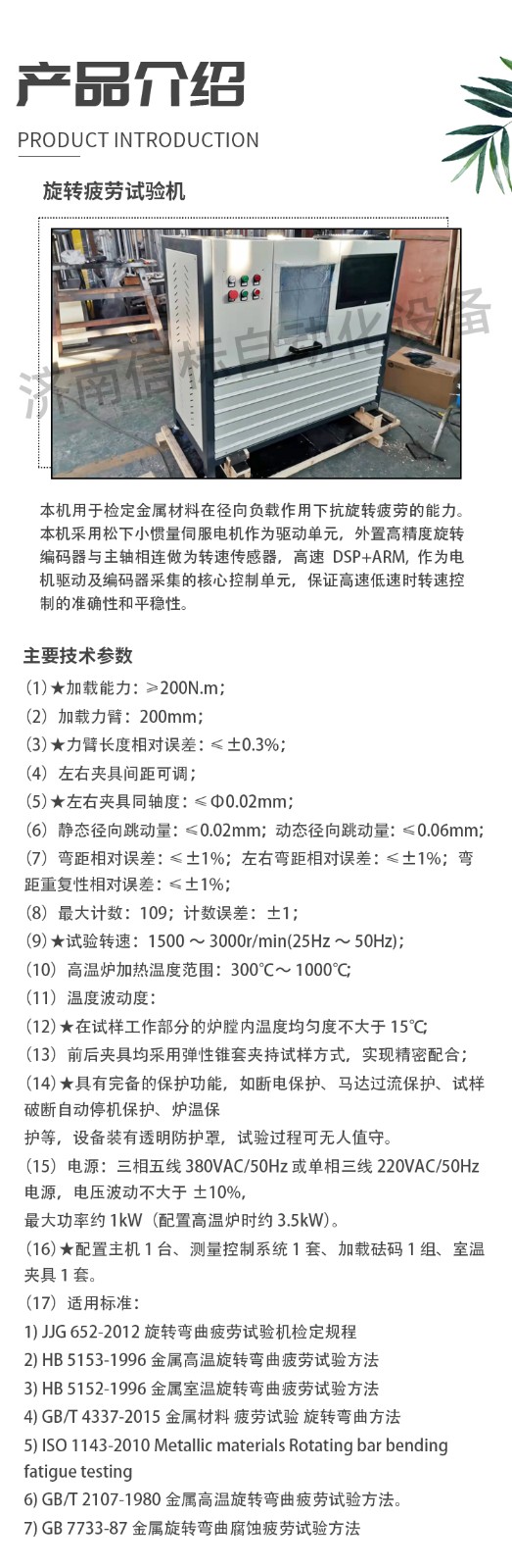 主要技術(shù)指標(biāo)(可根據(jù)客戶材料要求定制) (1)★加載能力:≥200N.m; (2)加載力臂:200mm; (3)★力臂長度相對誤差:≤±0.3%; (4)左右夾具間距可調(diào); (5)★左右夾具同軸度:≤Ф0.02mm; (6)靜態(tài)徑向跳動量:≤0.02mm;動態(tài)徑向跳動量:≤0.06mm; (7)彎距相對誤差:≤±1%;左右彎距相對誤差:≤±1%;彎距重復(fù)性相對誤差:≤±1%; (8)最大計(jì)數(shù):109;計(jì)數(shù)誤差:±1; (9)★試驗(yàn)轉(zhuǎn)速:1500~3000r/min(25Hz~50Hz); (10)高溫爐加熱溫度范圍:300℃~1000℃; (11)溫度波動度: (12)★在試樣工作部分的爐膛內(nèi)溫度均勻度不大于 15℃; (13)前后夾具均采用彈性錐套夾持試樣方式,實(shí)現(xiàn)精密配合; (14)★具有完備的保護(hù)功能,如斷電保護(hù)、馬達(dá)過流保護(hù)、試樣破斷自動停機(jī)保護(hù)、爐溫保 護(hù)等,設(shè)備裝有透明防護(hù)罩,試驗(yàn)過程可無人值守。 (15)電源:三相五線 380VAC/50Hz 或單相三線 220VAC/50Hz 電源,電壓波動不大于±10%, 最大功率約 1kW(配置高溫爐時(shí)約 3.5kW)。 (16)★配置主機(jī) 1 臺、測量控制系統(tǒng) 1 套、加載砝碼 1 組、室溫夾具 1 套。 (17)適用標(biāo)準(zhǔn): 1)JJG 652-2012 旋轉(zhuǎn)彎曲疲勞試驗(yàn)機(jī)檢定規(guī)程 2)HB 5153-1996 金屬高溫旋轉(zhuǎn)彎曲疲勞試驗(yàn)方法 3)HB 5152-1996 金屬室溫旋轉(zhuǎn)彎曲疲勞試驗(yàn)方法 4)GB/T 4337-2015 金屬材料 疲勞試驗(yàn) 旋轉(zhuǎn)彎曲方法 5)ISO 1143-2010 Metallic materials Rotating bar bending fatigue testing 6)GB/T 2107-1980 金屬高溫旋轉(zhuǎn)彎曲疲勞試驗(yàn)方法。 7)GB 7733-87 金屬旋轉(zhuǎn)彎曲腐蝕疲勞試驗(yàn)方法