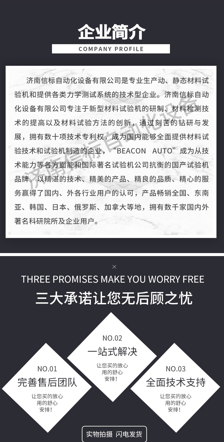 濟南信標自動化設(shè)備有限公司主要生產(chǎn):動靜態(tài)萬能疲勞試驗機,接骨板彎曲試驗機,縫合線拉伸疲勞試驗機,髖膝關(guān)節(jié)磨損試驗機,電子萬能試驗機、液壓萬能試驗機、巖石三軸、四軸,電液拉力試驗機,材料試驗機,高低溫蠕變,高低頻疲勞,拉伸、扭轉(zhuǎn)、杯突等二十多個系列兩千多個的品種。